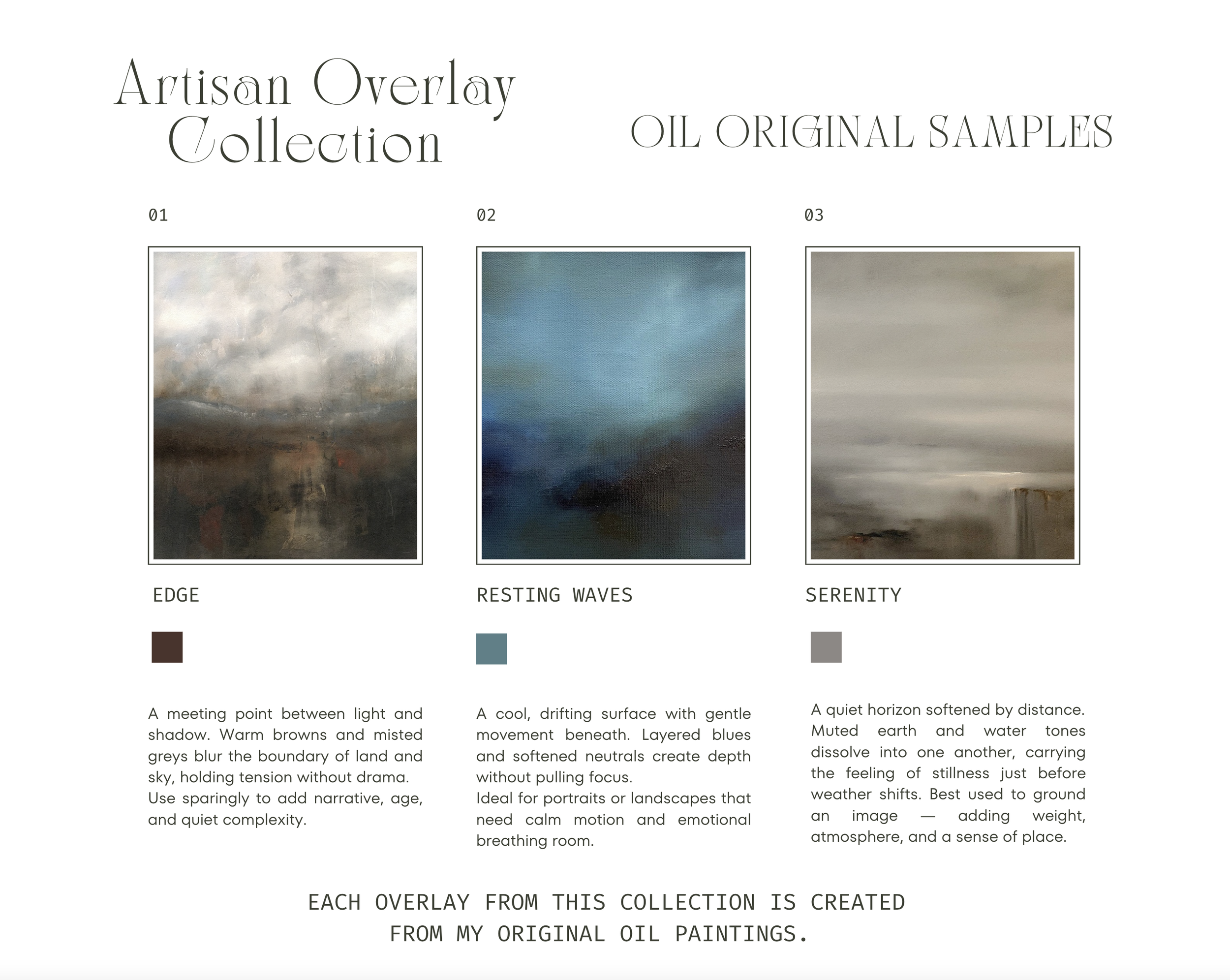 I created the artisan overlays, textures, graphic blends and typography from my own fine art and mixed-media work — extending my physical studio practice into the digital space. These elements were never meant to be decorative assets. They were meant to function as quiet collaborators in the creative process.