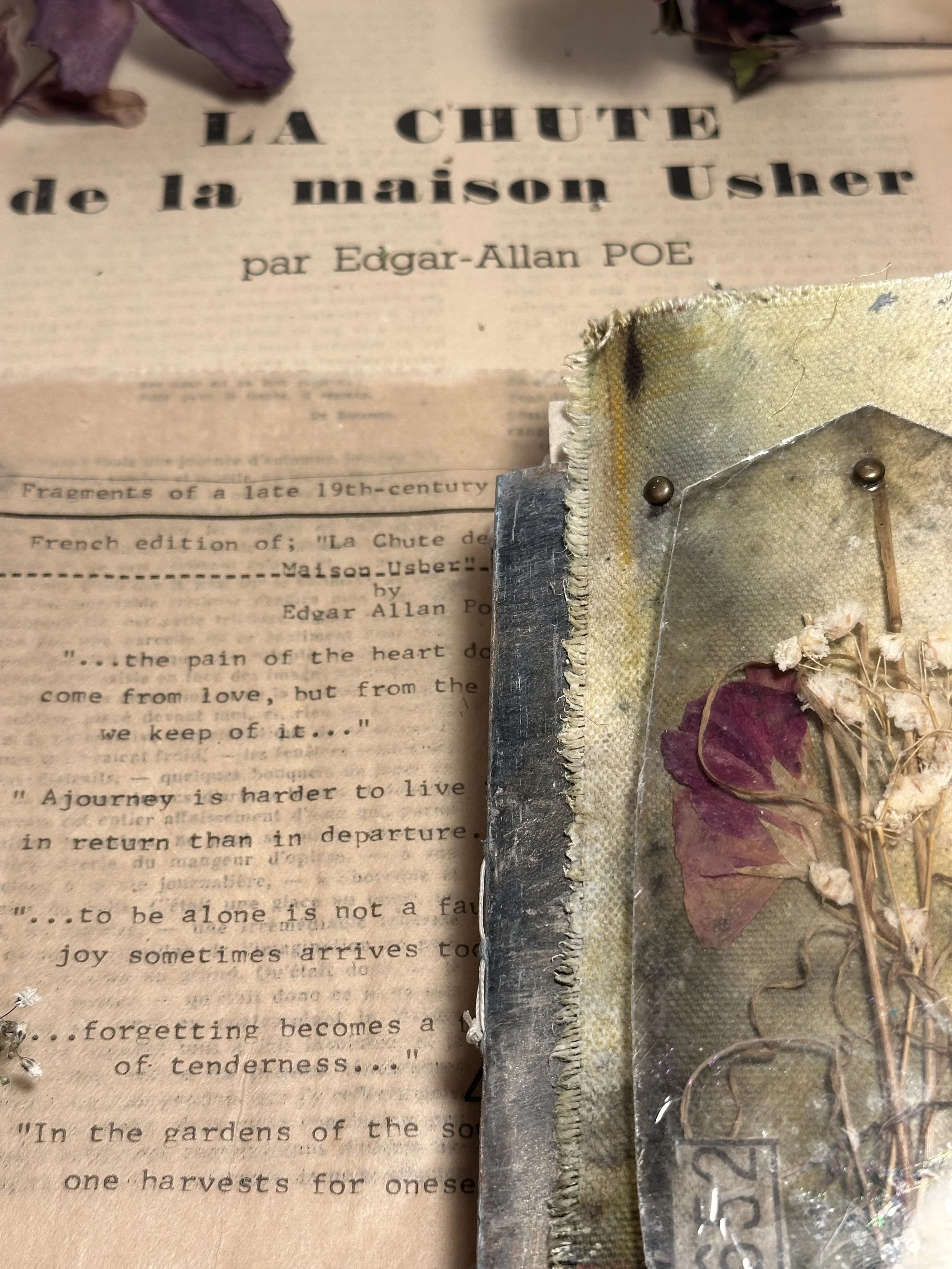 I didn’t meet Edgar-Allan Poe, not really. But I met him the way artists do—through fragments, through touch, through a sentence that refuses to stay quiet. I was at my table assembling a piece built around “La Chute de la Maison Usher”. His name. His words. His house.I didn’t know, when I began, what the day would hold. The same day…just hours later, my husband’s family farm burned down. (all were safe but the sadness sifted in…)