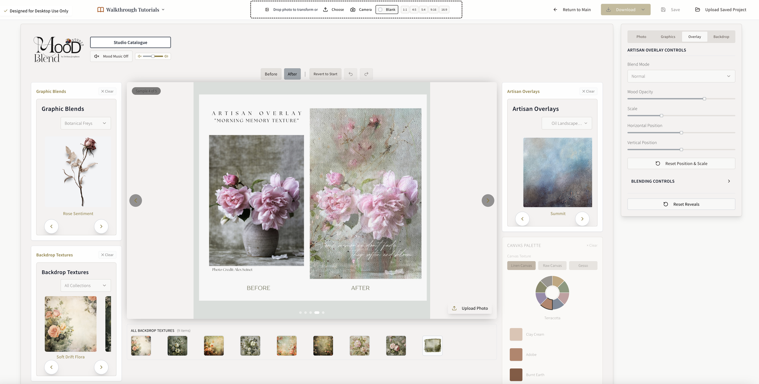 Alongside the software, I created a Studio Catalogue — a visual companion that offers a closer look at the artisan overlays, textures, and graphic blends that live inside Mood Blend Studio™.