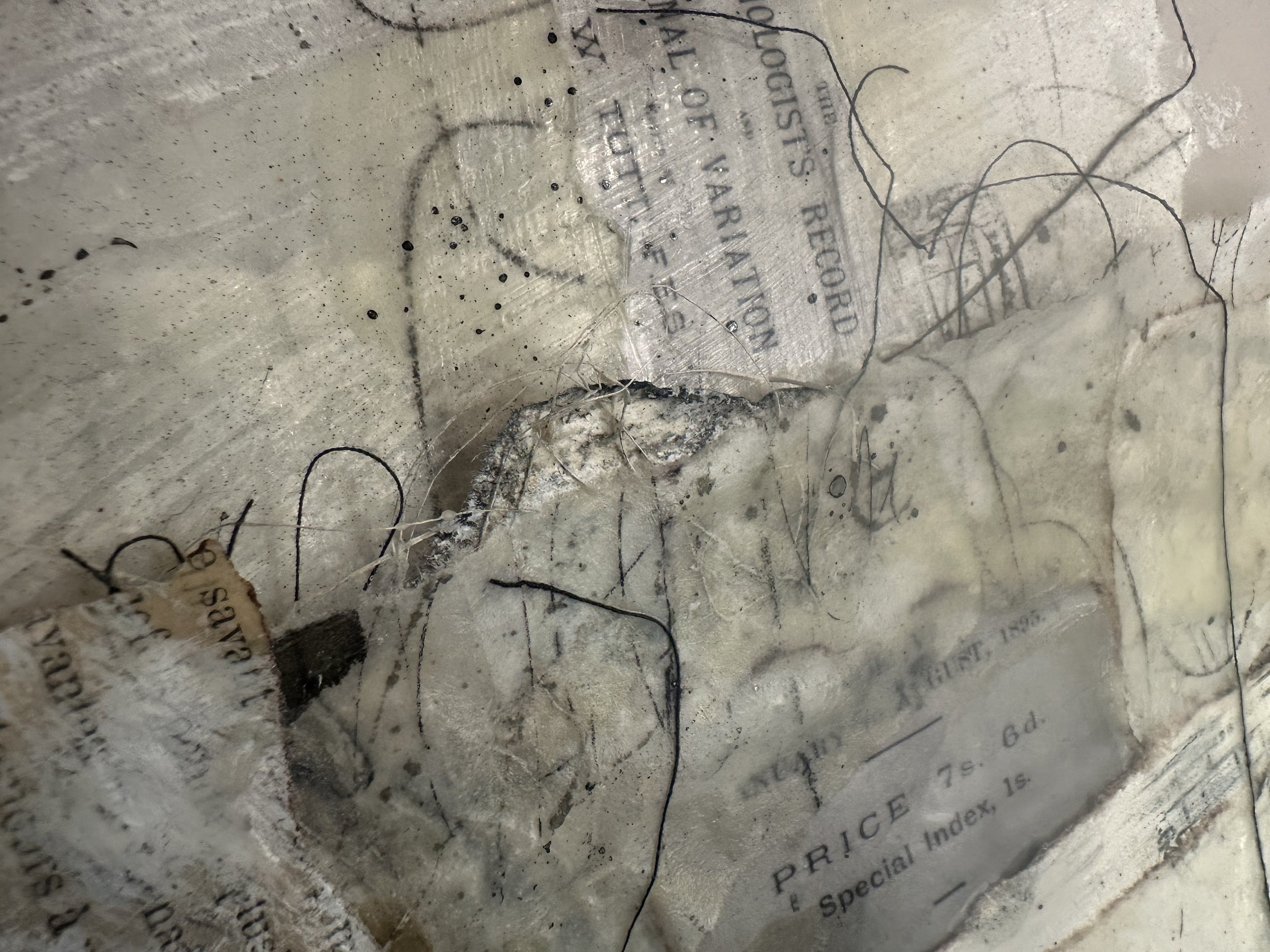 My mixed media work is rooted in a love of texture, layering, and physical depth. Each piece is built slowly and intuitively, combining oil and cold wax, encaustic processes, nuno felting, handmade and hand-dyed papers, typed words, and collected nature elements. The materials themselves guide the work — inviting touch, pause, and close looking.